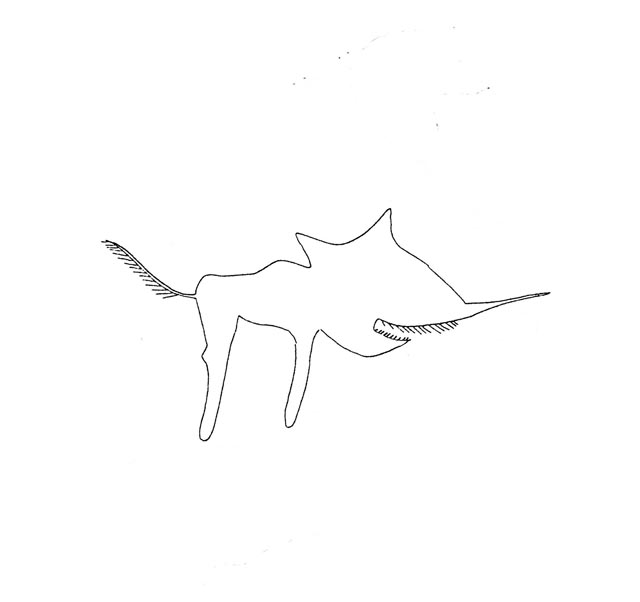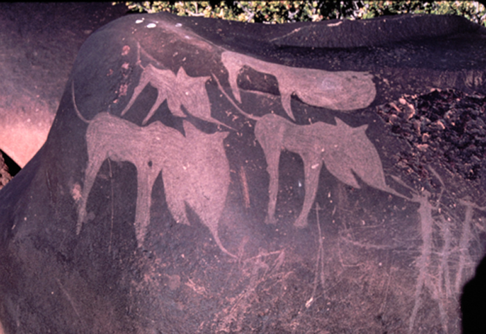 Northern Cape Province of South Africa, showing several small mammals with sengi-like heads (view image of engraving), were initially thought to be fantasy composite animals, but because they clearly have tail bristles, most surely these images represent Petrodromus (view image of tracing). These are the only known rock images of sengis, but oddly there are no Petrodromus currently within hundreds of kilometers of the engravings.